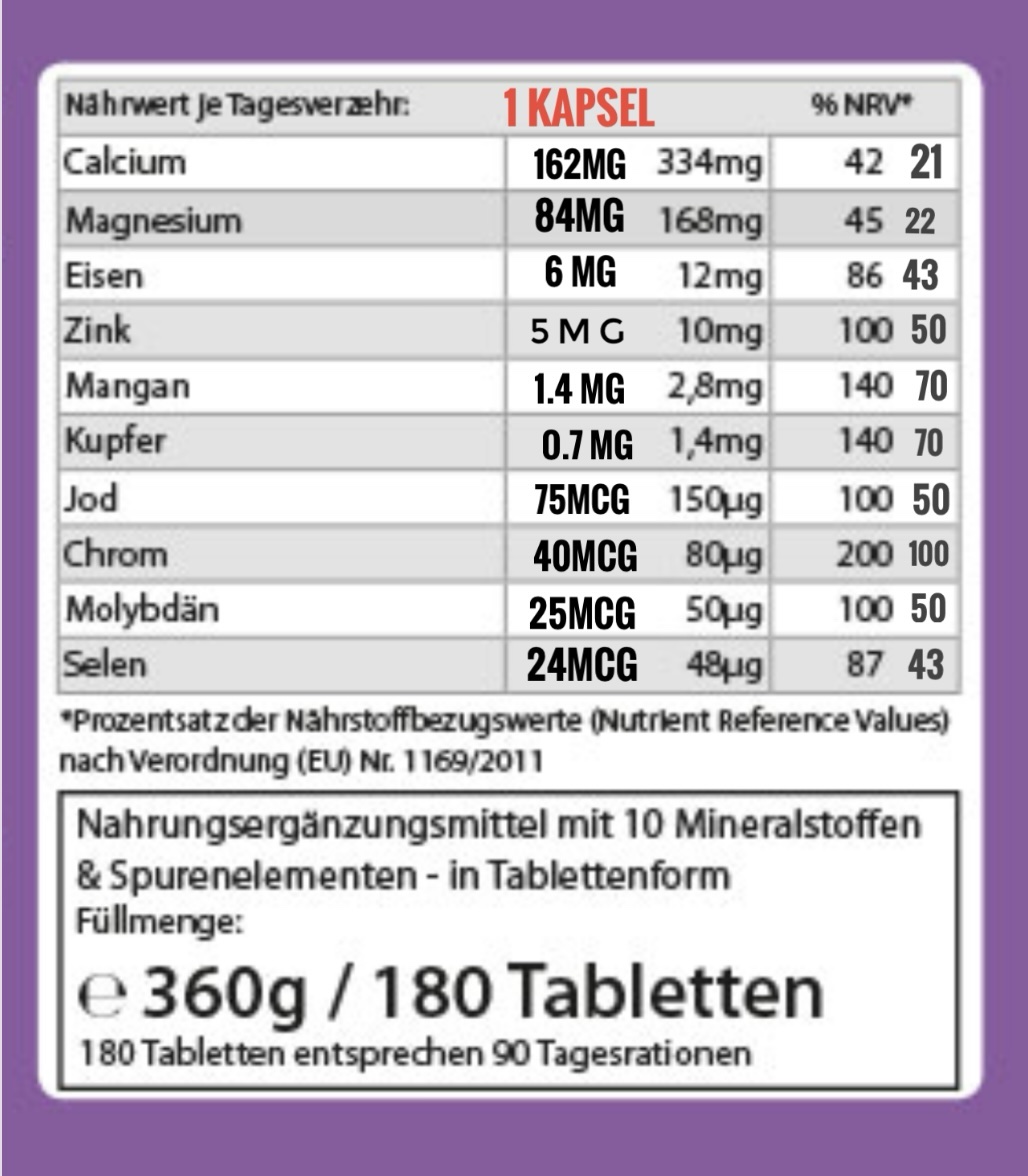 Nahrungsergänzungsmittel für Menschen mit Calcium, Magnesium, Eisen, Zink, Mangan, Kupfer, Jod, Chrom, Molybdän und Selen.