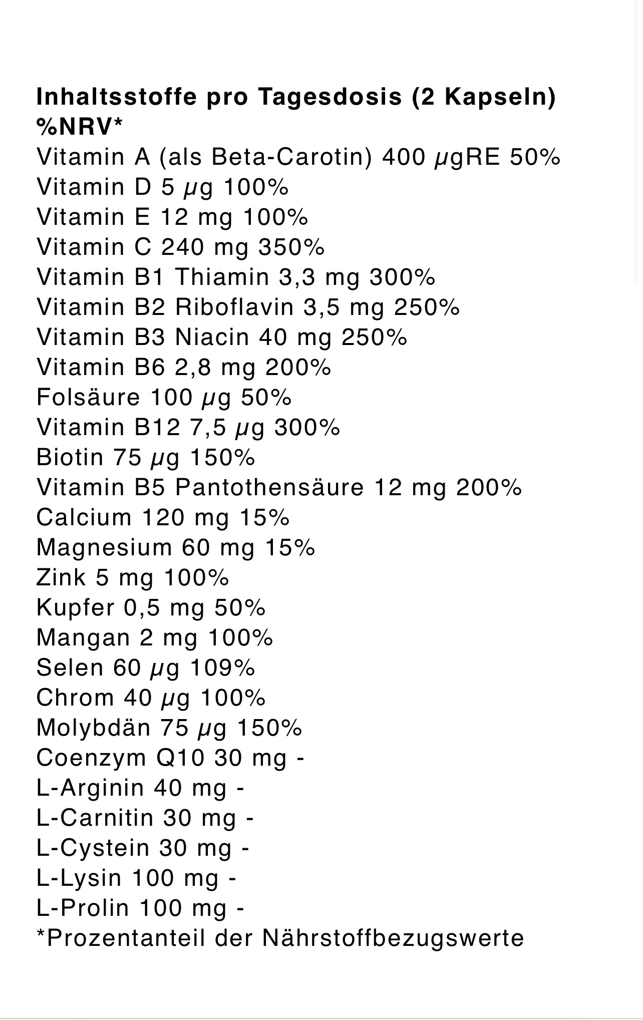 Zutaten Calciumcarbonat, Überzugsmittel: Hydroxypropylmethylcellulose, Citrus Fruchtextrakt, L-Ascorbinsäure, Reismehl, Magnesiumhydroxid, L-Lysin-HCl, L-Prolin, L-Ascorbylpalmitat, Zinkgluconat, Magnesium-L-Ascorbat, L-Carnitintartrat, L-Arginin Base, Niacin (Vitamin B3), Vitamin E, L-Cystein Base, Coenzym Q10, Reismehl, Mangan-II-Gluconat, Calcium-D-Pantothenat (Vitamin B5), Beta Carotin (Vitamin A), Natriummolybdat, Natriumselenit, Thiamin-HCl (Vitamin B1), Riboflavin (Vitamin B2), Pyridoxinhydrochlorid (Vitamin B6), Vitamin D3, Kupfercitrat, Folsäure, Chrom-IIIChlorid, D-Biotin, Methylcobalaminhydrat (Vitamin B12)
